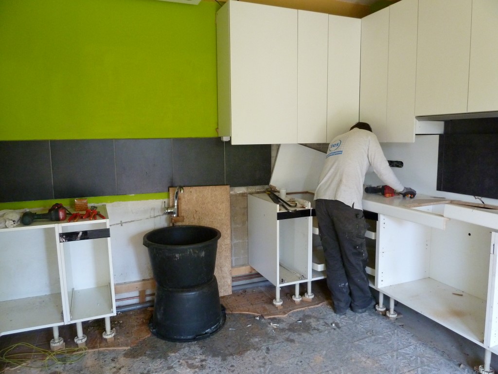 In de keuken proberen pa en Niels wijs te worden uit de leidingen en elektra. Op zaterdag trakteert Linda ons op een uitgebreid broodjesbanket tussen de middag. En op zondag (1e Paasdag) komen twee klushazen uit Kerkrade ons helpen met ontvetten en schuren van de balken boven.
